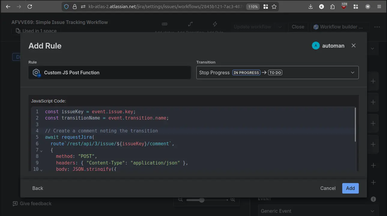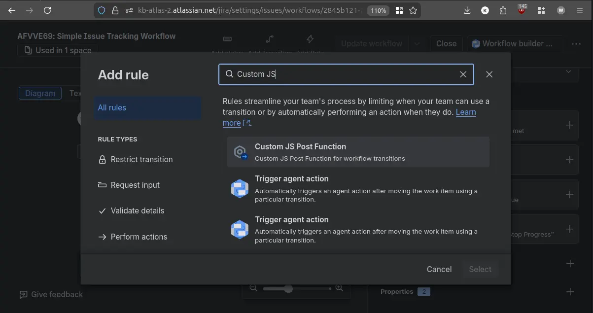 Execute custom JavaScript code when work items transition through workflow states in Jira.